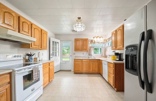 The gourmet kitchen is a chef's dream, complete with old school appliances, open space, and all the cookware you need to whip up a delicious meal. Enjoy your culinary creations at the elegant family-style dining table.
