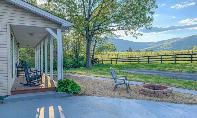 You'll notice the fire pit out front when you pull up; a delightful feature that can be used year-round throughout your stay. The entire front of the house directly faces King Family Vineyard and has unobstructed views of the winery and the mountains. There is a front patio so you can sit and sip while taking in the scenery, along with the fire pit and rocking chairs on the farmhouse-style front porch. We provide enough seating out front to host you and your crew for fireside fun!