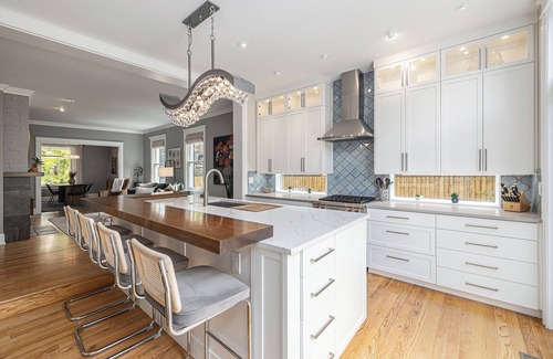 The open-concept living area flows effortlessly into the gourmet kitchen, creating a perfect setting for both relaxation and entertaining. The living room features a stylish yet cozy ambiance, with a modern fireplace, plush seating, and a large flat-screen TV ideal for movie nights. Our dedicated office space offers privacy with doors that close, providing a quiet environment for focused work. Equipped with a desk and ergonomic chair, it's perfect for staying productive during your stay.