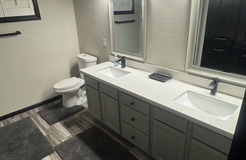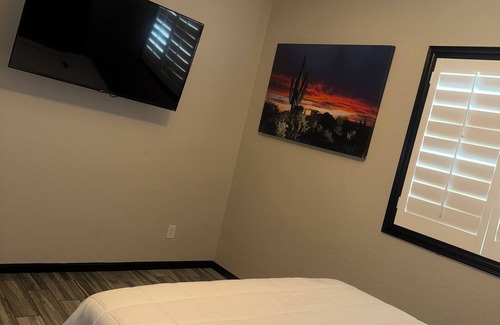 This property has three bedrooms on the right side, where you will be staying. You will notice that the living room and kitchen are set up for you when you first go inside our home. You can then take a right and proceed down the long hallway after that. Three bedrooms total—two queen-sized, one king-sized, and a shared bathroom—make up your whole stay. As you enter the house, the laundry room is the first door on the left.