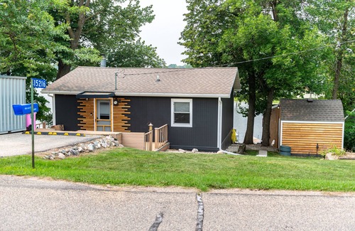Rustic modern cabin, in which the main cabin includes two (2) bedrooms. One contains a queen bed, and the other contains three (3) bunk beds (full size). Please note, there is a detached guest house with one (1) queen bed and a dedicated workspace. This is included in the # of beds for the listing. The restroom is located inside the main cabin. Please note - there is not a separate bathroom in the guest cabin. Warm and cozy living room with a fireplace and a view of the lake from the back deck in the main cabin. Keyless entry allows you into main cabin and guest house. Hooligans Lakeside, Pit 611, and many other restaurants, shopping, golf, and activities within a short walk or drive. Public boat access is close to the cabin as well.