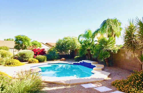 This home is spacious and handsomely decorated and furnished to ensure that your stay is most comfortable and enjoyable. It is located on a quiet cul-de-sac in an attractive and charming neighborhood. The beautifully landscaped backyard invites family and friends to the covered patio for a BBQ meal and drinks, and then a refreshing swim in the pool while enjoying endless Az. sunshine. Maybe even a friendly match on the play putting green could be had. There is a large greenbelt beside the home that provides a generous space to play catch, picnic, let the little ones run around, play on jungle gym, or for taking walks.