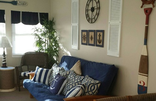 The cottage features ALL UPDATED MATTRESSES IN BEDROOMS queen size bed in the Master bedroom and in the second bedroom with a twin sleeper sofa, the sun room is also used as a third bedroom with a queen size futon and the living room has a queen size sleeper sofa. The kitchen comes fully equipped with dishes, cups and silverware. The laundry room has a full size washer and dryer for your convenience. There are plenty of places to enjoy your meals with an eat in kitchen, sunroom, a picnic table on the front covered porch and backyard patio dining area where you can also grill all the family’s favorites on the gas grill. Later, enjoy the evening making smores sitting around the campfire ring under the stars. And for those warm summer nights cottage is equipped with air conditioning.