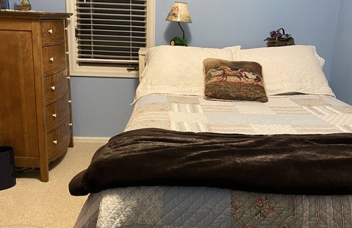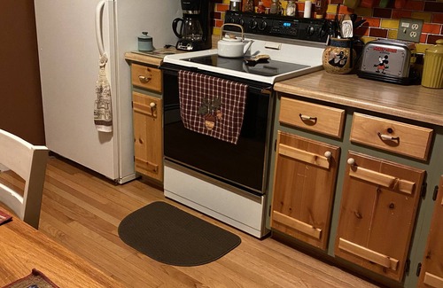 This property is a private home with an extended family living area. Enjoy your privacy with your own parking and separate keyless entry. This short term rental offers a gas grill and hot tub on your back deck to delight in night time stargazing . This one bedroom rental has an adjoining family room with additional beds if needed. The kitchen is fully stocked with what it takes to enjoy preparing a meal. The living room offers a beautiful view of the landscape as well as birdwatching along with the wildlife. So come enjoy the quiet country area of Bellvue.