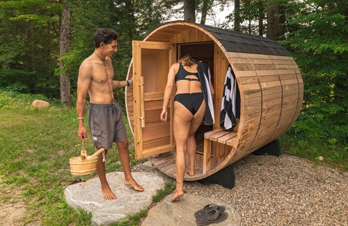 Sage House at Camp Greenwood is tiny vacation living at its finest. The house offers one loft bedroom (queen bed), full kitchen with four-burner electric stove and oven, farmhouse sink, butcher-block countertops, microwave, french press coffee maker, heat and AC, secondary lounge loft with Smart TV and retro Nintendo mini system, high speed WiFi (300 mbs), Poly and Bark sofa, tiled shower, traditional flushing toilet, washer and dryer unit, Casper mattress, outdoor area with Breeo fire pit, Weber grill, and Adirondack chairs, a barrel sauna, and private camp pond...just to name a few features. Come enjoy Vermont in a whole new way! Dogs welcome with a $100 pet fee.