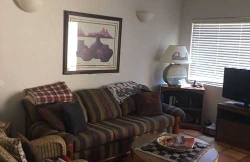 The Thistle Dew vacation rental condo at Solano Vallejo is a 2 bedroom 2 bath home that is equipped for up to 6 people. Master bedroom has a King Size bed, second bedroom has 2 Twins. From the patio you can see the 11th green of the beautiful Moab golf course and spectacular views of the LaSal Mountains and surrounding red rocks. Within walking distance of some of Moab's most famous petroglyphs and many trails just minutes away.