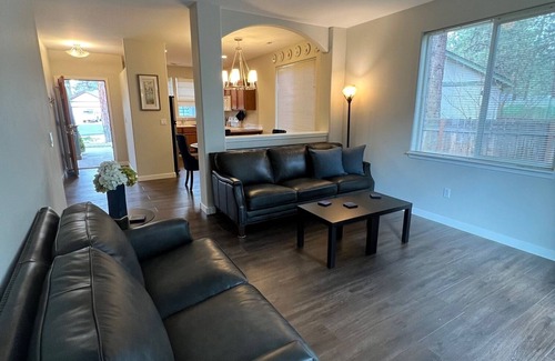 Come enjoy Bend and have a comfortable home to stay when you aren't busy playing. In a peaceful residential neighborhood in SW Bend, you're close to all that Bend has to offer. This three bedroom home has a king bed, a full bed, and third bedroom with two twins. There is also a standing desk for any remote workers.