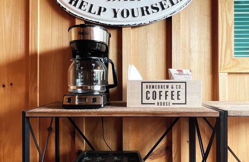 * Main Level: The open floor plan includes the living and dining areas with lake views and soaring ceilings. The dining table seats 8 comfortably, and the kitchen is fully equipped with cooking utensils, pots, pans, baking dishes, a crockpot, a toaster, and a coffee bar. A private bedroom with a queen-size bed and a full bathroom are also located on this level.