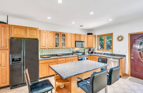 When youre feeling hungry, whip up your favorite homemade meal in the fully equipped kitchen which features gorgeous wood cabinetry and a center island accompanied by 3 bar stools. Prepare a hearty feast and enjoy it with the whole group at the dining table beneath the orb chandelier. For those interested in dining al fresco, move the festivities out onto the deck.