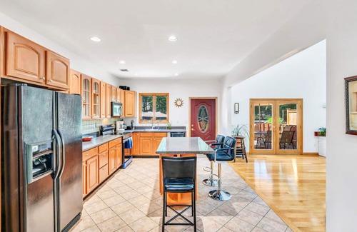 Usable Fireplace, Air Conditioning, Dryer, Internet (Wifi), Bed Linens, Washer, Gym/Fitness Room, Hair Dryer, Living Room, Parking, Bath Towels, Private Entrance, Kitchen, Carbon Monoxide Detector, Smoke Detector, Hot Water, Refrigerator, Pool/Beach Towels, Stove, Oven, Ice Maker, Dishwasher, Microwave, Coffee (Pot), Toaster, Dishes and Silverware, Pots and Pans, Television, Game Room, Ping Pong Table, Garage, Laptop-Friendly Workspace, Pots and Pans
