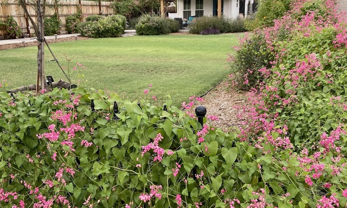 Out front, our extra-large covered porch is a guest favorite for morning coffee or sunset wine. Dine al fresco under the vine-covered pergola, surrounded by lush landscaping that creates a true oasis in the heart of town. And yes, your furry friends are welcome—our huge, fenced yard is a paradise for dogs, complete with a doggy door for easy access.