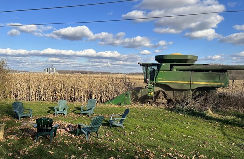 The grassy backyard backs up to a farm field is great for the kids, play Cornhole bag toss game, and is the perfect spot to close out each day as the stars come out.