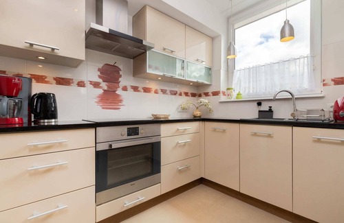 The holiday apartment can accommodate up to 4 and consists of a living room with a double sofa bed, a kitchenette, a bedroom with a double bed and a bathroom with a bathtub. The amazing asset of the apartment is its private garden with a plot of 100 m², fitted with garden furniture perfect for basking in the sun. Fully surrounded by the greenery, the garden is away from noises of the neighborhood, proving the sense of quiet privacy. The apartment is also pet friendly, so the garden can be a source of joy and fun for canine companions. The indoor space is very functional and comfortable, fully equipped to fulfill every holiday need. The extensive range of kitchen and bathroom amenities ensures self-sufficiency, while multimedia – a flat-screen SmartTV, with the access to cable channels and Internet, and free Wi-Fi network can provide evening entertainment. Additionally, guests travelling by car can park on a private spot on an outdoor parking lot or on the publicly available parking spaces on the estate.