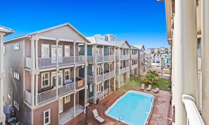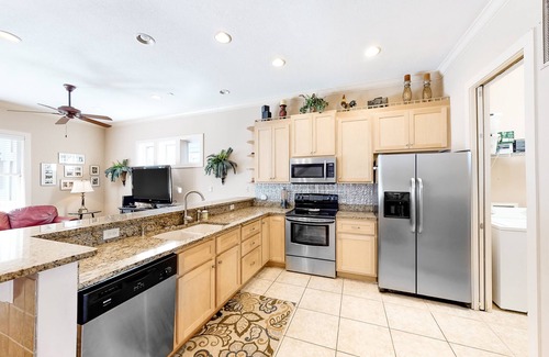 With a sparkling shared pool right outside your door and the beach just across the road, a stay at this beach home is sure to please everyone in your group! Spread out over three floors, this spacious vacation rental features a well-equipped, full kitchen with stainless steel appliances and a breakfast bar, a cozy, sunlit living area with a cable-equipped flatscreen TV, and French Door access out to a furnished balcony. You'll also find a furnished patio on the ground floor that puts you just steps away from the pool.