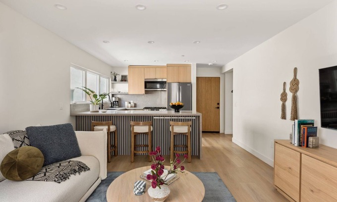 Located on the first level of the property, Unit B features open views of Highland Ave from the bedroom. Inside, the open-concept living space includes a plush lounge area with a smart TV, a dining counter, and a fully equipped chef's kitchen featuring top-tier appliances and custom light wood cabinetry. The bedroom includes a queen-size bed with high-quality linens and a Juliette balcony with sliding glass doors to bring in the fresh ocean air. A modern full bathroom with spa-like finishes and a walk-in shower completes the experience.