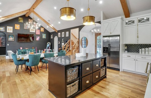 Kitchen is fully loaded with pots, pans, silverware, kitchen utensils, plates and much more, perfect for preparing meals with a large dining table, kitchen bar area and breakfast nook.