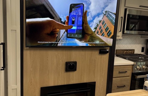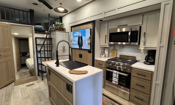 This on-site Luxury RV comes TURN-KEY and sleeps 9 Just bring your family and food! Enjoy a CUSTOM Tiki Bar with outdoor kitchen (grill and outdoor refrigerator), plenty of seating and entertaining area as well as a fire pit area. There are two Master Bedrooms with queen beds and one has an en-suite bathroom. There are four rooms total in this rv. The other three all have queens and one has an additional twin bed all with three inch sleeper toppers for comfort. . The living area and kitchen are both well appointed with plenty of seating.