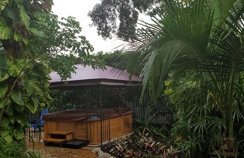 The Tiki Hut unit is privately located on the property, plenty of space for 5 guest, 2 bedroom, upper bedroom has a half bath , queen bed and a full bed , toilet and sink and is accessible by spiral staircase, lower bedroom bathroom has a King bed bathroom has a walk in shower with stack washer and dryer. Spacious living area with a fully functional kitchen. The property is an acre of lush tropical plants. Conveniently located to the downtown and beach, we allow a dog 35 lbs or less Pets over 35 lbs will require owners approval