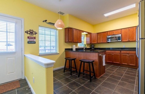 On the main living level, there is plenty of room to spread out. Besides the beautiful lanai, there is an indoor large living area to relax and watch tv on the big screen as well as an indoor bar for hanging out or enjoying meals. Adjacent to the bar is a large dining room with bench seating and two end seats that can accommodate up to 10 guests. Along with the dining room and bar, there is additional seating at the kitchen counter with two bar stools. Along with the many gathering and dining areas on the main level, there is one bedroom that offers a twin bunk bed and futon sleeper which can accommodate 3 guests.