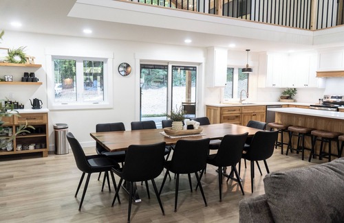 The beautiful, fully furnished kitchen, complete with custom white oak cabinets and solid surface countertops, has a full size fridge, stove, dishwasher, and microwave. The kitchen is stocked with cookware, all the utensils you should need, a handheld electric mixer, blender, toaster, crockpot, large roaster, mixing bowls, etc. The coffee bar includes a Ninja Dual Brew 12 cup coffee maker with a frother, which can make full pots of coffee, as well as individual K-cups and iced coffee. We provide starters of regular and decaf coffee beans, with a grinder to grind the beans. We also offer some K-cups. However, if you have a group that drinks lots of coffee or have a favorite coffee preference, please bring your own or extra. There are also tea bags there for you tea lovers. Enjoy meals at the table, which can seat up to 12. We provide a high chair for babies, and the bar seats 4.