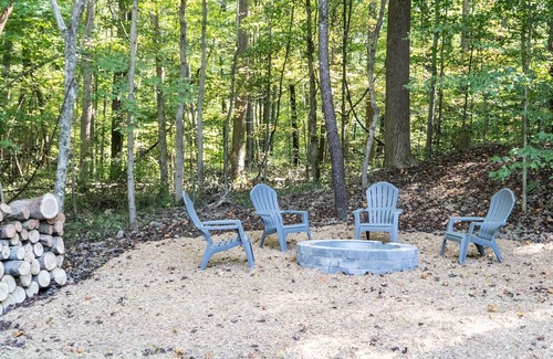 The dining and kitchen area opens to the large covered deck at the back of the house, where you can sit and watch the birds, deer, squirrels, etc, as you drink your morning coffee, chat with family and friends, play games, or grill your favorite foods over the Weber grill. If you use the grill, we ask that you please clean the grill so it's ready for the next guests. You will find grill cleaning supplies in the laundry room. There is a wood burning fire pit in the back yard. Feel free to take the plastic adirondack chairs to the fire ring. Please leave the rockers on the patio. The surrounding woods can be explored as well - AT YOUR OWN RISK.