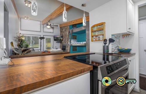 Timber Lodge was renovated in 2016. Aside from its lift-level views of the ski slopes, other wow-factors include a built-in triple-decker bunk bed, massive stone fireplace with an electric insert, and unique floor plan for extra sleeping privacy. The living room and bedroom have front-row views of the ski slopes and passersby on the ski lift. Dining is bar seating for four at the galley-style kitchen bar. The bedroom has two queen beds partitioned by a permanent privacy divider. Additional sleeping capacity is provided by triple-decker bunk beds (three twins) in the living room (huge hit with kiddos!). Each bunk has a cubby with reading light and USB outlet. This unit comfortably sleeps up to seven, subject to the limitations of having only one bathroom. You'll love the short walk to the ski lift and Bryce Resort's facilities. The living room features a substantial stone fireplace (not wood-burning), cozy furnishings, and a smart TV (streaming only). The bedroom also includes a smart TV. The bathroom features separate powder and shower/commode rooms. A stacked full-size washer/dryer unit is located in the bedroom closet.