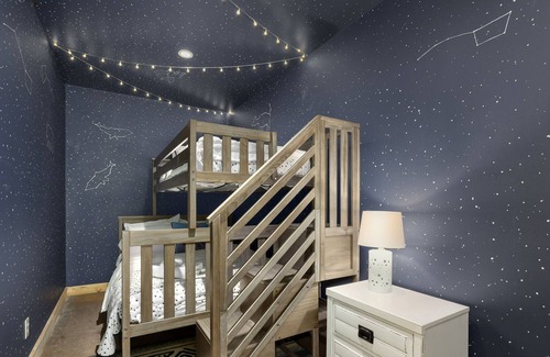At the end of the day, settle into one of our nine luxury beds. Choose from (1) Our first Master bedroom is complete with a King bed, closet, 36-inch Vizio Smart TV, a door leading to the patio and en suite bath. (2) Our second Master bedroom has a King bed, dresser, 50-inch Vizio Smart TV, a door leading to the patio and en suite bath. (3-4) Through a door in our second Master bedroom, you'll find our first set of Twin bunkbeds with a hand-painted mountain mural and string lights. (5) Our fourth bedroom is complete with a King bed, hanging rack, 50-inch Vizio Smart TV, a door leading to the patio and en suite bath. (6-7) Through a door in our fourth bedroom, you'll find our second set of Twin bunkbeds in our starry night-themed room. (8) In our loft, you'll find a Queen bed as well as a seating area, trunk for storage,35-inch Vizio Smart TV, desk area and retro game console. (9) Finally, in our Game Room, you'll find our queen-size pullout couch.