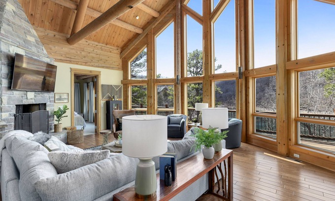 ★ MASSIVE open-concept living room with floor-to-ceiling windows overlooking Beaver Lake.