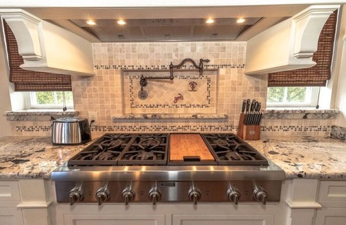 Chef’s gourmet kitchen with stainless steel appliances, large island & butler’s pantry