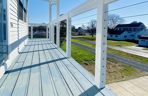 Tilghman Treasure is a 2 bedroom 2 bath private waterfront suite and the perfect getaway. Flooded with tons of natural light the living space has panoramic water views. Two sliding doors open out on to the deck where guests can BBQ or relax and watch the boats on the Narrows. The primary bedroom has a full bed and private bath. The second guest room has a twin day bed with twin trundle perfect for 2 or for vacationing with the kids! During the day walk over to the properties dock and watch the boats coming in and out of the Knapps Narrows. The evenings can be spent roasting marshmallows at the properties firepit area.