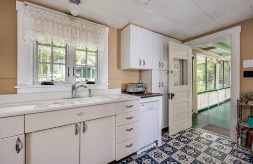 The living room features a brick-stacked fireplace and a flat-screen television with cable and a Blue-Ray DVD player. Prepare meals in the fully-equipped kitchen, providing both large and small appliances to make you feel right at home. Dine at one of the two four-person tables, or enjoy your dining experience on the screened-in porch and take advantage of the one-of-a-kind lake views. An outdoor grill is also available for your use.