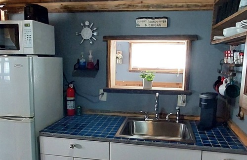 This 350 sqft Tiny Cabin is walking distance to Meadows trail head in Luzerne. One block east of the famous Ma Deeters Restaurant. This clean & cozy cabin is a perfect place to relax between enjoying the trails, rivers & local Amish shops. One queen size bed in the loft and a full-size pull out sofa sleeper. Don’t let the lack of a stove fool you. The cabin comes equipped with a griddle, 3qt Air Fryer, toaster oven and a single coil electric burner. As well as a propane grill with burner out in the fire pit area. There are pots, pans & utensils to cook with. There is Keurig single cup coffee maker. Complementary K-cups provided. Also note that the stairs up to the loft are “ladder” style. 4 seasons firepit out back. A propane grill is also available in the firepit area. Perfect for couples getaway, small family fun, or a boys weekend away! This location is also listed on another site. Availability calendar is updated regularly!