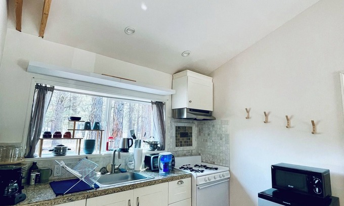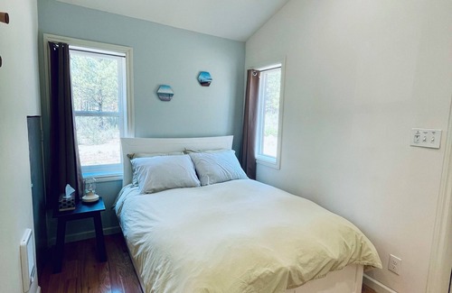 The cabin has a small bedroom with a double bed, a full bathroom, and an open living room and full kitchen. In the living room are two futon chairs that convert to two twin-sized beds. We have parking for multiple cars and an outdoor space with a couple of chairs. We welcome your pets too! Here are some other important notes for staying at cabin: 1 - There’s no Wifi at the cabin and cell service is spotty for most carriers so you'll be unplugged from tech during your stay; plan ahead and prepare for a break from technology.