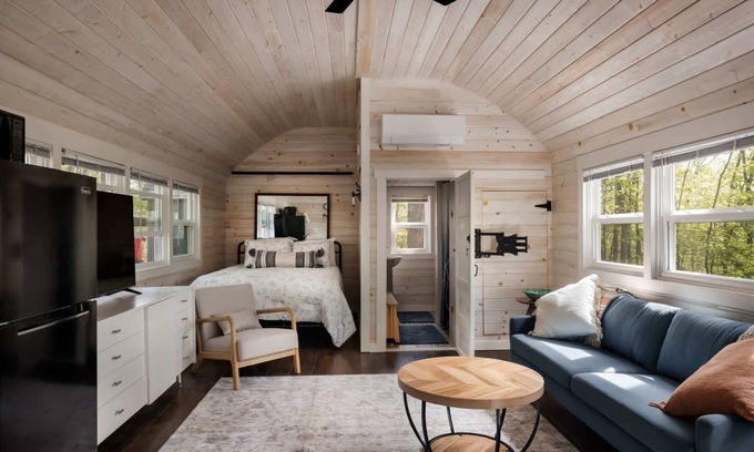 This modern tiny cabin nestled in the scenic wilderness of West Virginia, blends cozy vibes with contemporary flair. This tiny cabin is the perfect retreat for nature lovers who appreciate modern comfort, playful touches, and a dash of whimsy.