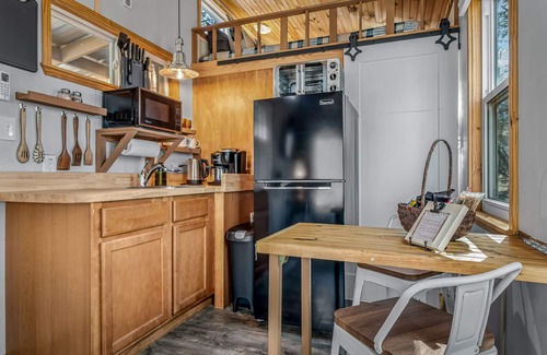 Stepping inside the front door, you will love all that this peaceful retreat offers guests. With only 200 square feet of indoor living space, Tiny Cub House packs a punch with all of its amenities! To the right, there is a queen bed with a memory foam mattress and comfortable bedding (extra blankets are in the upper cabinet). There is a small electric fireplace to enjoy on cool mornings when you're inside, and there is 43" Roku TV and very fast Wi-Fi for streaming your own channel subscriptions. A desk at the foot of the bed can be used as a remote workspace, and the lamp has a USB charging port. Tiny Cub House has a remote-controlled mini split HVAC system for heating and cooling, small ceiling fan, bathroom ventilation fan, and a dehumidifier in the loft area, so it definitely makes for a very comfortable space and is loved by our Guests.