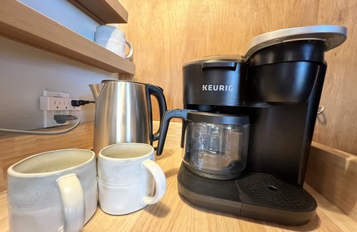There is a small fold-down dining table that can be lowered from the wall, and then with the press of two buttons, the hinges will allow it to fold up and give you more floor space. In the kitchenette, you will appreciate the thoughtfulness of the homeowners, as there is a beautiful butcher block countertop all the necessities for your retreat in the woods. There is a refrigerator, double-door toaster oven, microwave, 12-cup coffee maker, electric water kettle, 4-quart slow cooker, electric countertop double cast iron burner, electric griddle, stainless cooking pots, teak wood cooking utensils, can opener, dishes, drinking glasses, wine glasses, eating utensils, coffee mugs, cooking spices, and more!