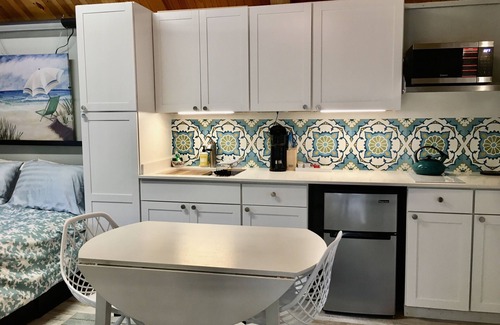 Tiny for Two + Pet! Explore Minimalist Living in this 12' x 24' chic shed studio home in the serene countryside. The yard is fenced for privacy and your small furry friend! Enjoy the sounds of nature when you stay in our unique tiny guest home that is centrally located to lots of activities: