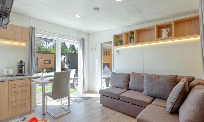 The cozy living area with sofa bed, dining area and well-equipped kitchenette invites you to spend time together with your family. In the separate bedroom it is wonderful to dream. The sofa bed in the living area is 170 cm long and therefore only suitable for children. In addition, the Tiny House has its own bathroom with shower.