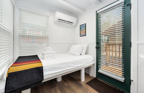 Thoughtfully designed, this tiny house features a bathroom with a stall shower, providing a rejuvenating retreat after a day of outdoor adventures. The space-saving kitchenettes includes a sink, microwave, and a mini refrigerator, offering essential amenities for a delightful stay. A bar-top seating area creates a cozy space for meals and great conversation.