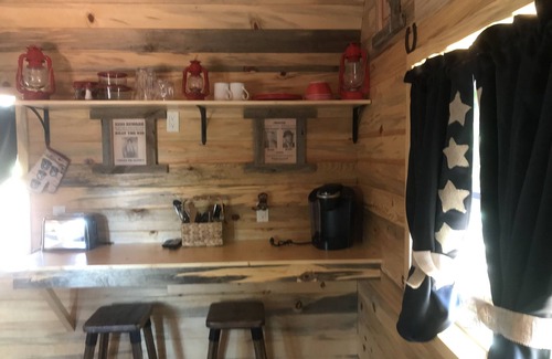 Enjoy the feel of being out in the country while being only half a mile from the conveniences of town. This home was recently completed by a master craftsman. It is a work of art with custom features in a cowboy style. It is a true tiny home, so there is a ladder to reach the king bed in the loft. If you've ever wondered what it would be like to live in a tiny home, this is your chance to find out.