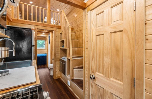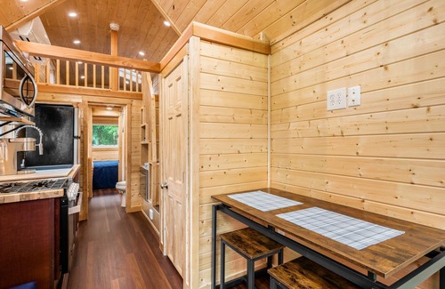 You have seen tiny homes on TV and now be one of the first to stay in this brand new tiny home! Sleeps 4 with 1st floor full size bed and queen size bed in loft. Kitchen fully equipped with gas range, refrigerator, dishwasher, microwave and Keurig. Dishes, glasses, silverware, pots and pans all supplied. You cannot stand in the loft area as the ceiling is very low. This quaint compact stay offers a private hot tub, charcoal grill and picnic table on the large outdoor deck.