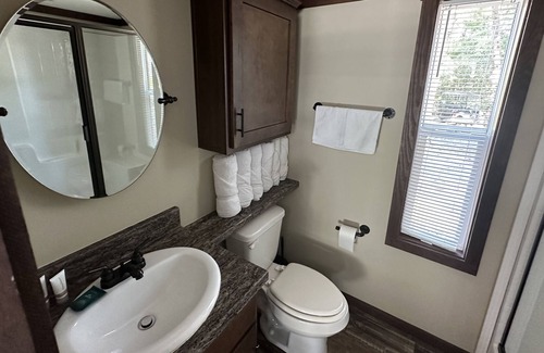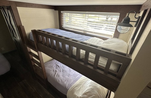 An unforgettable time with endless amenities! Book a private, luxury cottage at our beautiful new resort. This cottage sleeps 6 - a master bedroom with a queen mattress. A loft with 2 twin xl beds, perfect for kids! And 2 twin xl bunks in the hallway. Your cottage is stocked with dishes, towels, toiletries, coffee, 2 TVs with DirecTV, and more! Our resort has a lazy river, 2 waterslides, family pool, adult only pool with hot tub, tiki bar, 3 food trucks, gaga ball pits, pickleball courts, basketball courts and so much more! If you would like to rent a golf cart during your stay, contact our office prior to arrival to ensure one is available! To see more, view our social media pages or website @ Splash RV Resort. Booking can also be completed from our website.