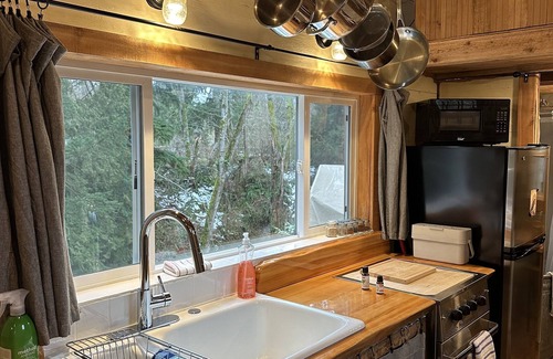 So THAT"S how gourmet mushrooms are grown!!? Overlooking the beautiful Walker Creek with huge trees, wildlife and lots of sun, this rustic,clean,cozy tiny home was built with the lovely gully in mind. Walking to Gibsons along the farm stand road allows us to enjoy the quiet, rural beauty and bounty only minutes from town. Truly the best of both worlds. Tiny is a non-conventional tiny home on wheels with an open floor plan for the feel of space, light and air... We know that not everyone can use composting toilets in their homes but we are lucky here to be able to give back to the planet with our bucket toilets, grey water filters and composting.....well everything.... ;) so be sure to ask for a tour of the mushroom facility and join us for some truly down to earth living. :)