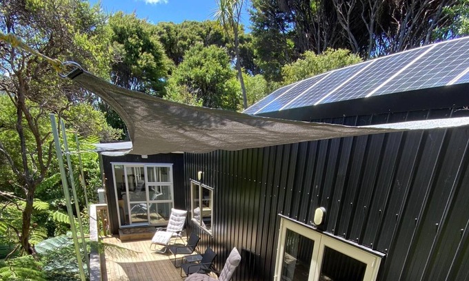 Newly-built Tiny Home only 3 minute walk from the lovely Pah beach. Across the road from the beach is also the post office, cafe, Irish pub and local dairy/ alcohol store making your stay easy and convenient with everything you need 3 minutes away. The bedroom has a double bed and there is another queen mattress in the loft upstairs (box stairs). All rooms have curtains. The Tiny-home and utility are connected by our large deck which overlooks beautiful native tress in which the native birds love to play. The utility cabin holds the kitchen and bathroom with a water flushing toilet. Our water supply is tank water and our power is solar power so we ask that you are mindful of your usage. We have now added an extra cabin so a maximum of 6 people can stay. However you will need to be extra conservative on water and power usage with 6 people.
