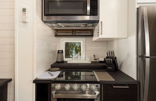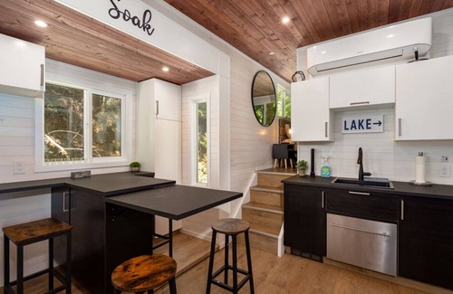 Full open kitchen with all you need to enjoy your stay and make all your favorite meals. This kitchen has everything a regular size home has just tiny house style. This kitchen is modern and stylish. Bar style seating in dinning room with fold out table to accommodate more seating. There is a BBQ and patio table set outside to enjoy your meals in the heart of nature.