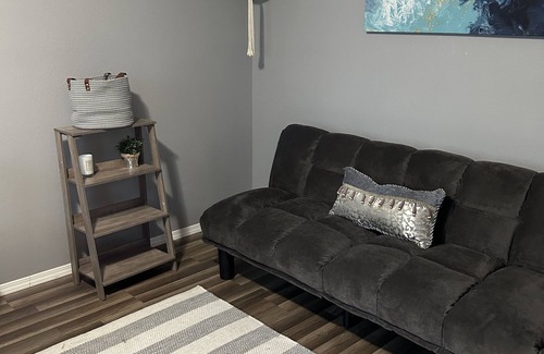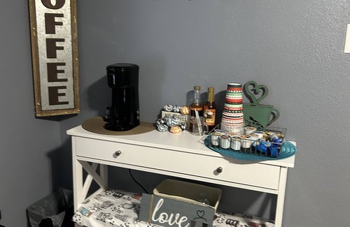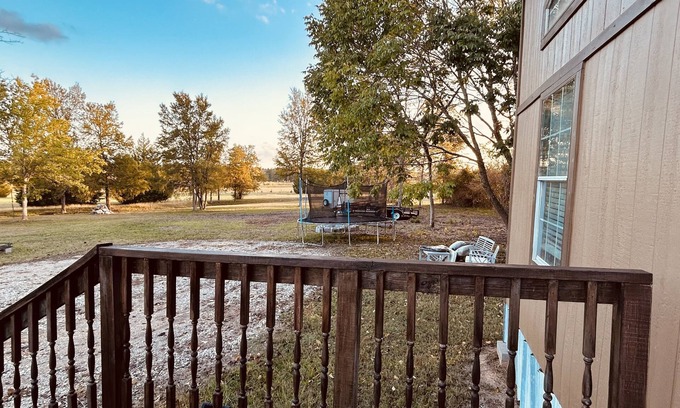 Tiny home on 6 acres with a peaceful view, deck/sitting area for morning coffee drinkers, and coffee bar. One common sitting area for eating. Wireless internet along with work station, our smart TV and Alexa add a nice chill vibe. Pack n play and/or sleeping cot available upon request! We live on property and are available for any needs.