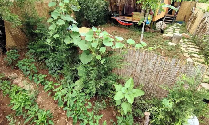 With a private entrance to the room, the house has kitchen, Air conditioning, shower and toilet, kitchen has got all equipment . This house is a wooden house in camping area. you can make own food in your kitchen. there is one bed, (one double size) one Couch where 3 people can accommodate comfortably. You can check the details in the photos. The garden is small but very rich in terms of flowers, vegetables, and... a platform to lay down to watch the sky in the night!