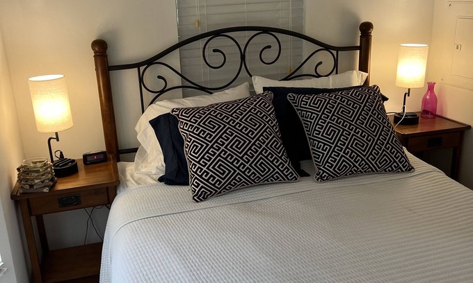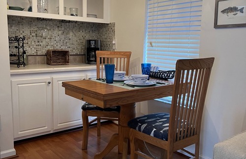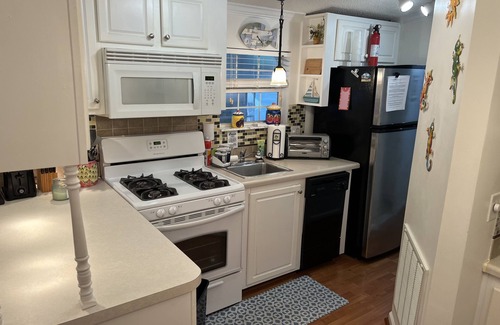 Cozy 1 BD/1BA "tiny house" with updated flooring, backsplash, wallpaper and amenities. The unit itself is 400 SF, with another 400 SF of enclosed screened in porch with ceiling fan, dining area and seating. Parking on both ends of unit. All appliances (gas stove/oven, microwave, refrigerator, dishwasher) with utensils, pots/pans and dishes are available for guests' use.