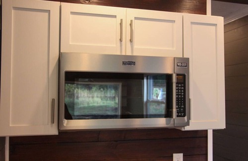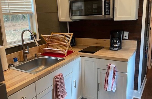 In our 1-bed, 1-bath container home, find all the conveniences for comfortable living. The thoughtfully designed interior includes a fully equipped kitchen with a coffee pot, full-sized sink, convection oven, 2-burner stove, a Blackstone grill on the porch, washer/dryer combo, and a full-sized refrigerator. Enjoy endless hot water with a tankless heater. Stay comfortable year-round with split air units for heating and cooling, easily cooling down to 65 degrees during the summer. Step outside to a cozy outdoor deck, or relax indoors in a space designed for both efficiency and comfort. Experience sustainable living without compromising on the comforts of home.