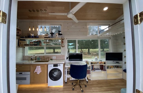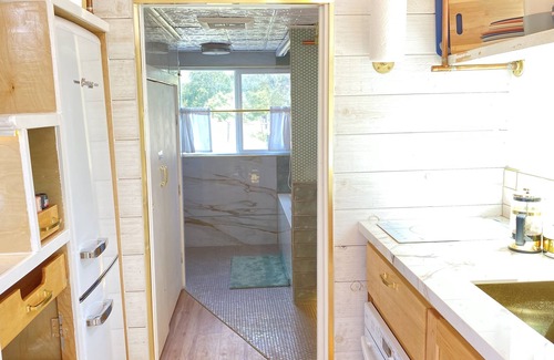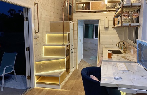 Gold finishings modern farmhouse style just built tiny house with everything you would expect to find in a Tiny House on Wheels. From unique storage to loft sleeping. Nice work from home space. Smart windows on remote. Sky light above bed that opens and closes for star gazing. Net loft for napping reading or suite case storage.